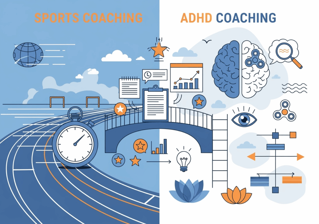A sportcoaching és az ADHD coaching jelentős átfedéseket mutat, hiszen mindkettő a fókusz, önszabályozás, motiváció és mentális ellenállóképesség fejlesztését célozza. A sportcoachingból átvett technikák – mint a strukturált célkitűzés, mindfulness, pozitív önbeszéd, vizualizáció és strukturált visszacsatolás – jelentősen gazdagítják az ADHD coachingot, miközben a kognitív viselkedésterápiás eszközök hatékonyan egészítik ki azt, segítve az ügyfeleket a negatív gondolati minták kezelésében és a rugalmasság fejlesztésében.